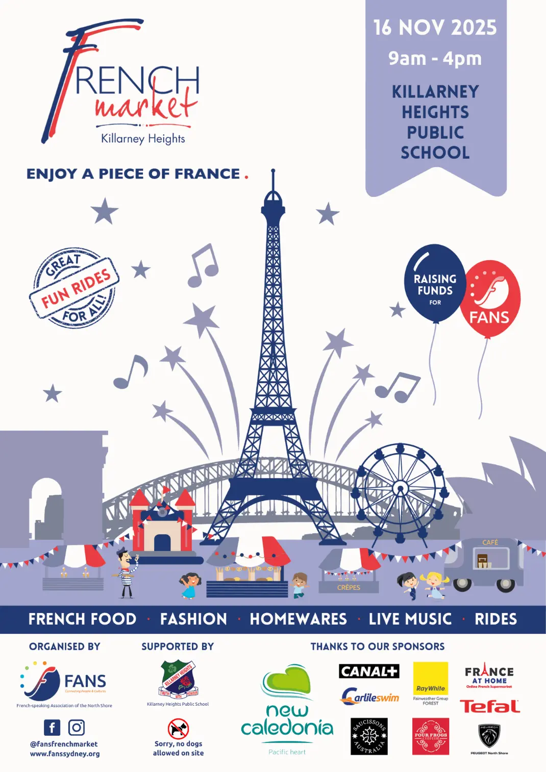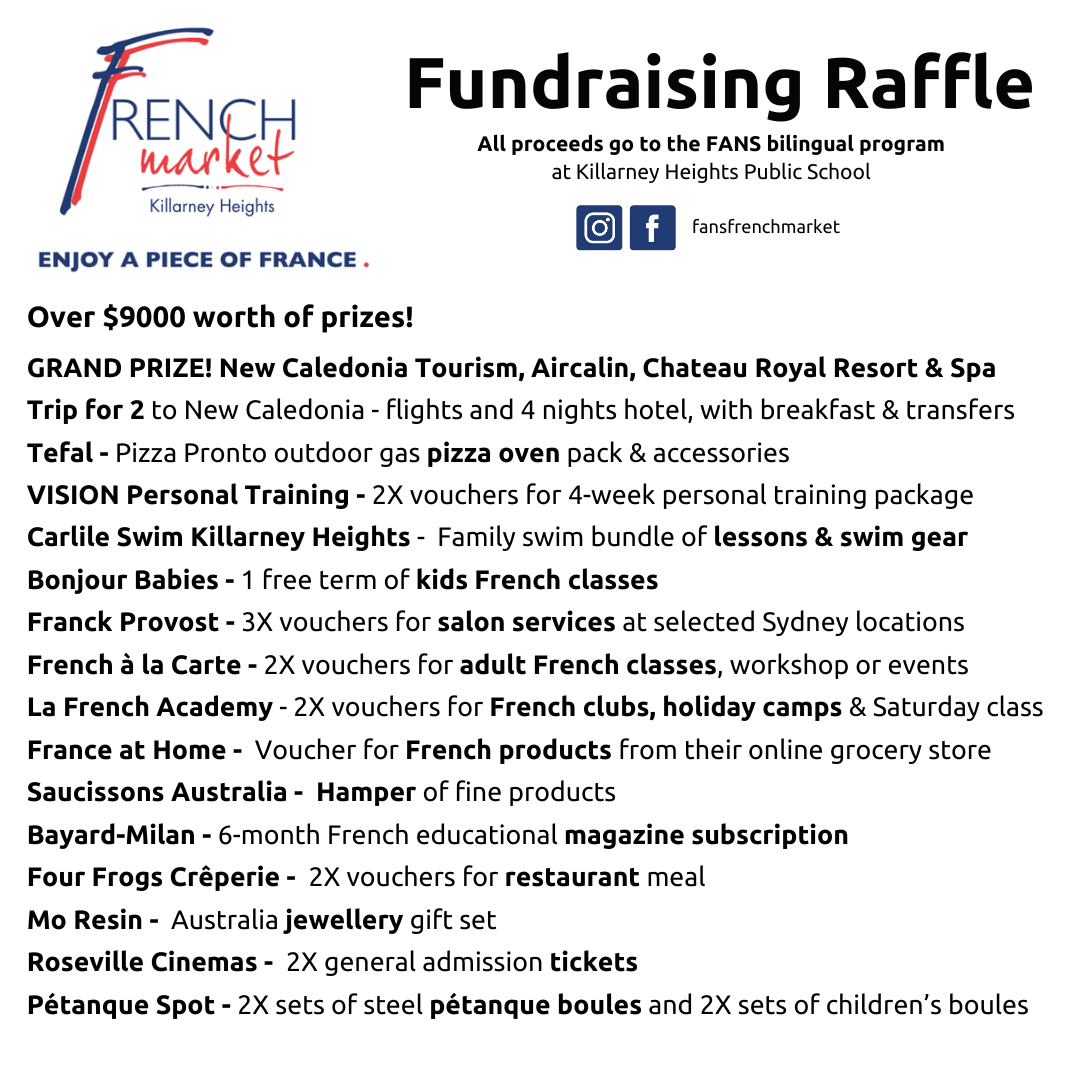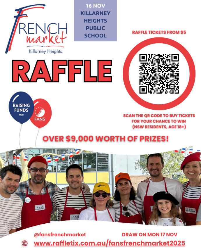 All proceeds go to FANS (French-speaking Association of the North Shore) and the French bilingual program at Killarney Heights Public School.